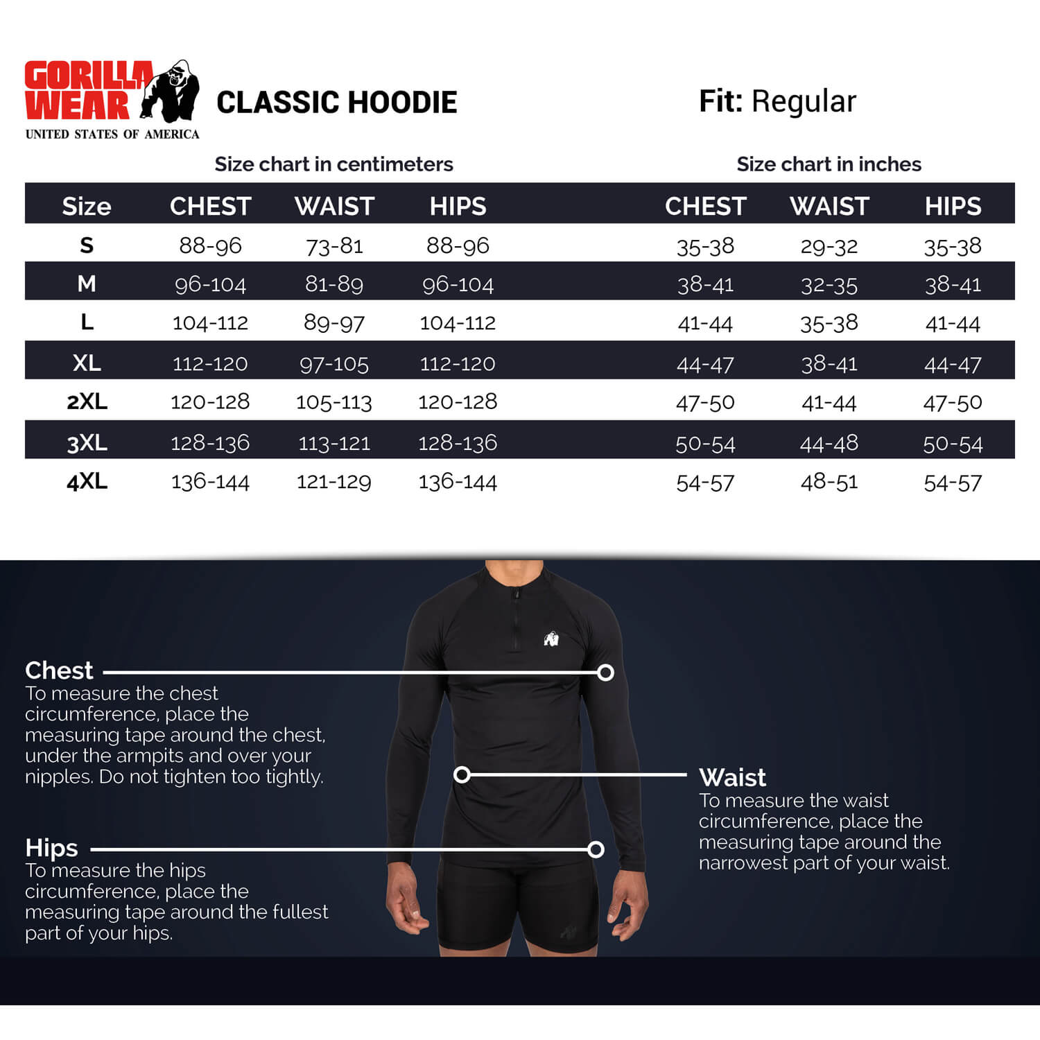 The name says it all, this Classic Hoodie flaunts the classic Gorilla Wear logo. This hoodie is suitable in a variety of situations, whether you’re at the gym, working out outside, or enjoying your days off. It is made of a blend of cotton and spandex, making the hoodie nice and stretchy. This ensures an optimal range of motion. The Classic Hoodie features a drawstring hood, elastic ribbed cuffs, and, of course, the classic Gorilla Wear logo on the chest. Please note that this hoodie runs small, therefore we recommend ordering one size larger.