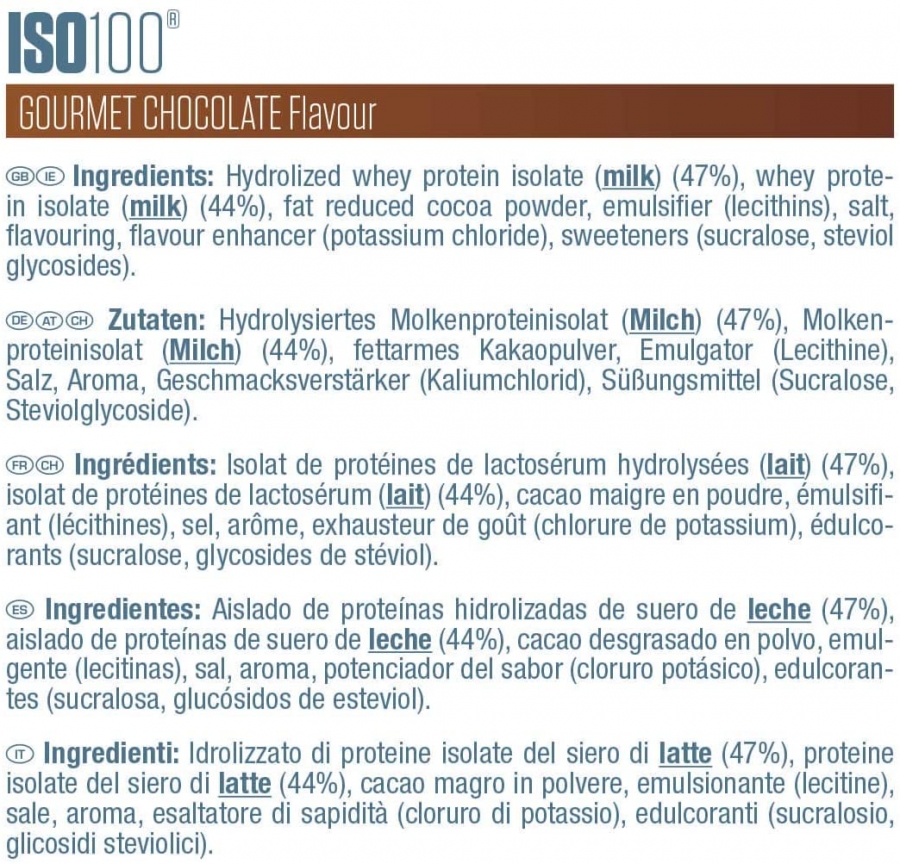 Hydrolyzed whey protein isolate (MILK) (46%), whey protein isolate (MILK) (45%), flavourings, acid (citric acid), tea extract (Camellia sinensis) (0,5%), sweeteners (sucralose, acesulfame K), colour (E150c), rapeseed oil, anti-foaming agent (silicon dioxide). May contain: EGGS, SOY.