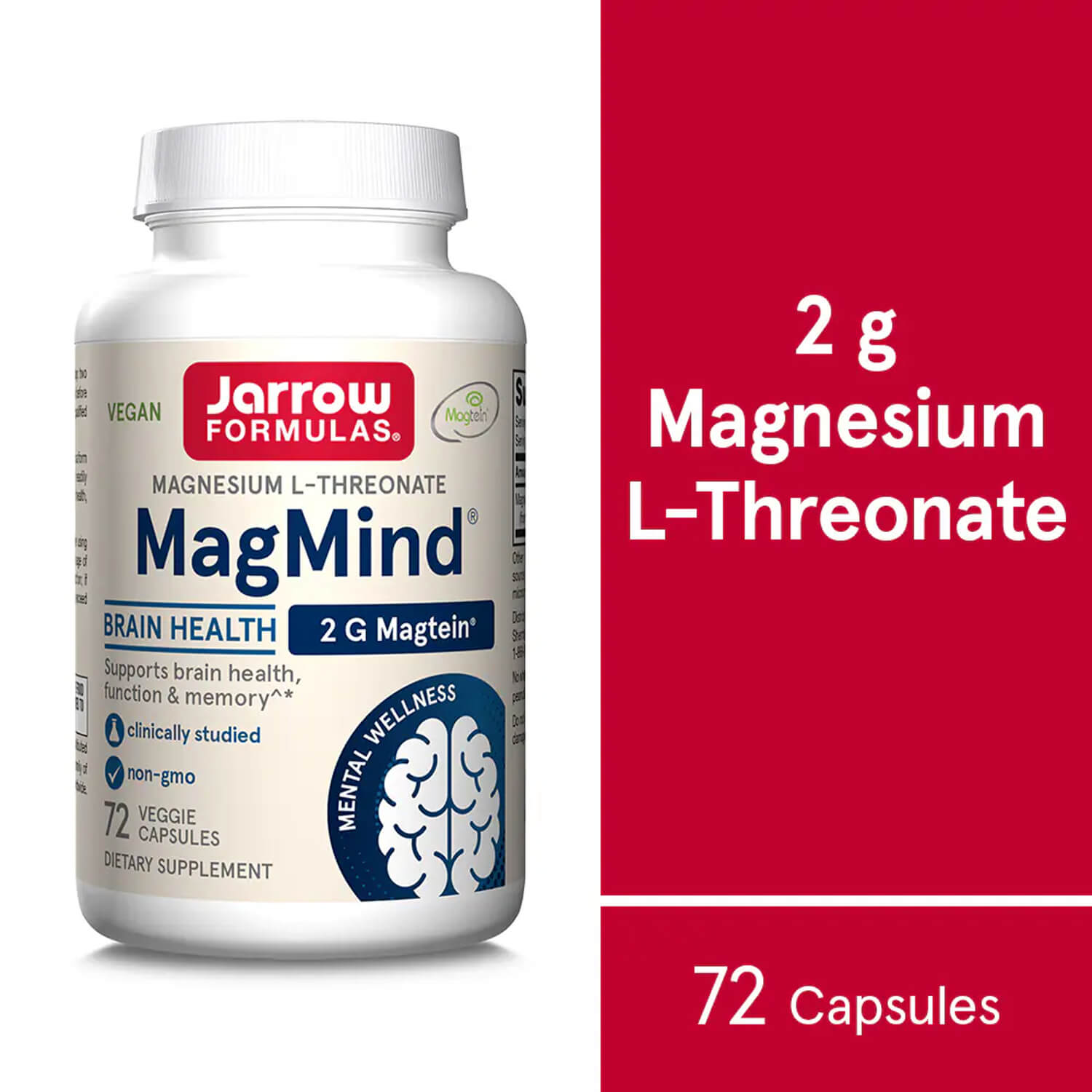 Jarrow Formulas® MagMind®, featuring Magtein®, is a form of magnesium from Magnesium L-Threonate that readily crosses the blood-brain barrier and supports brain health, function, and memory in healthy adults.
