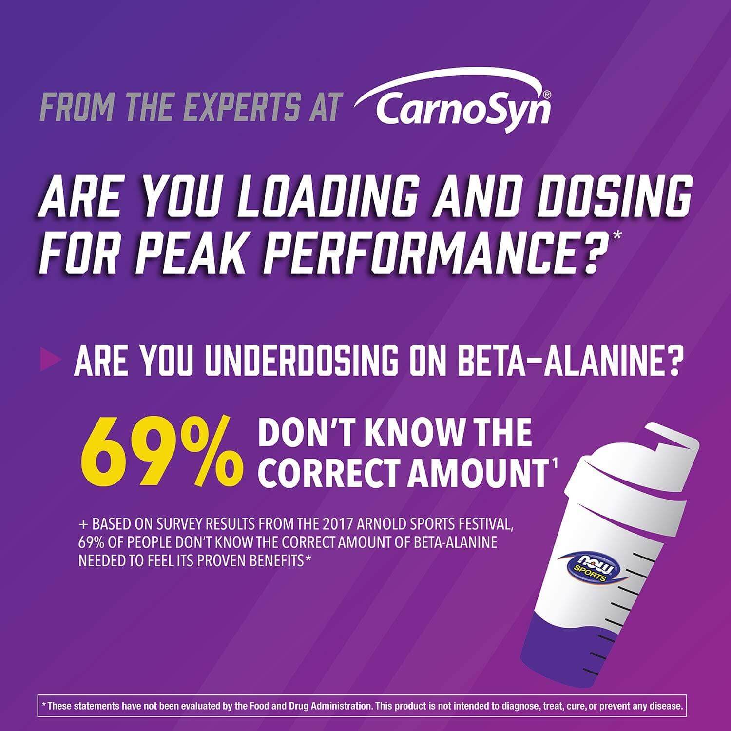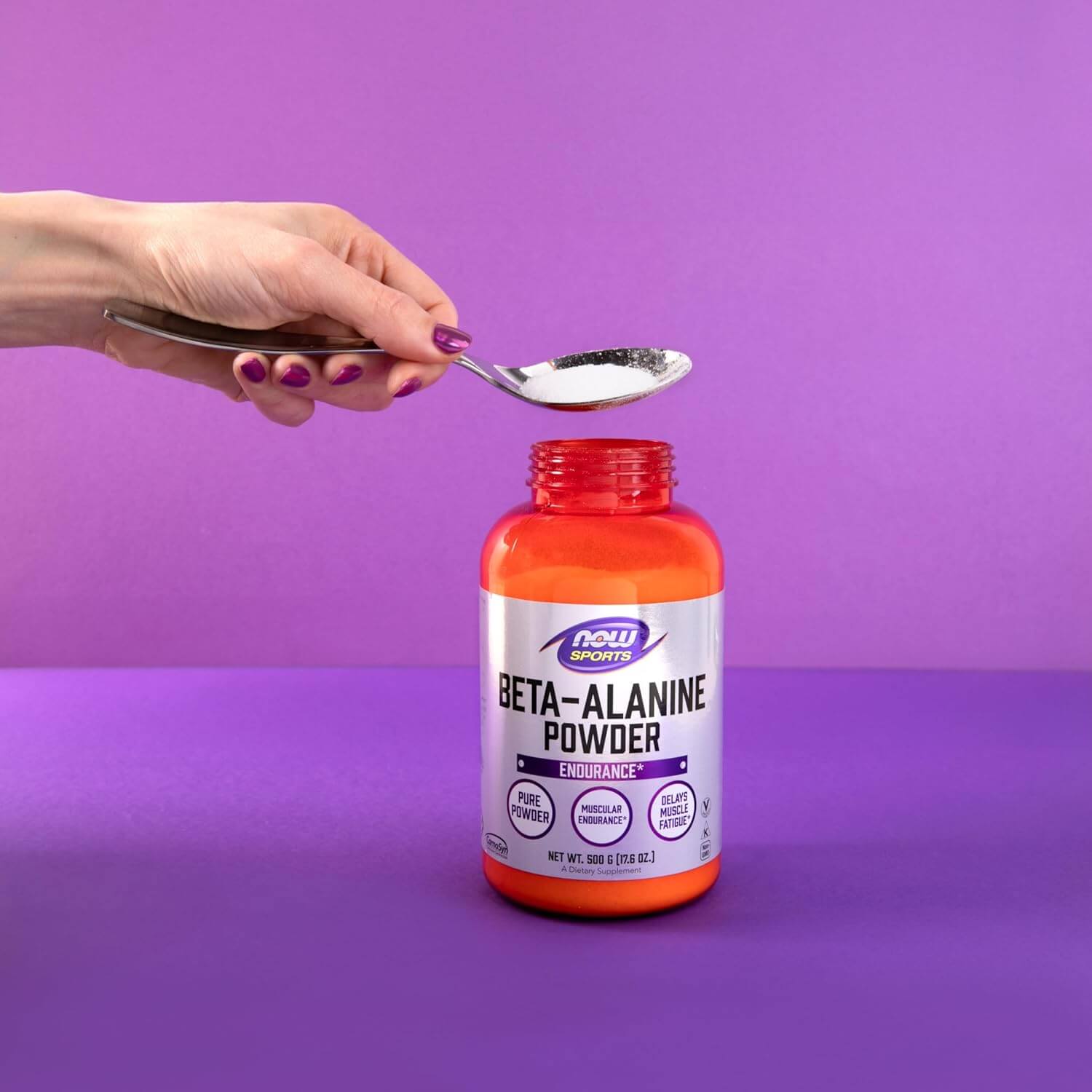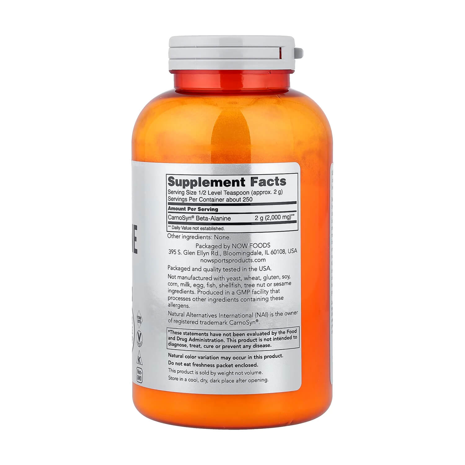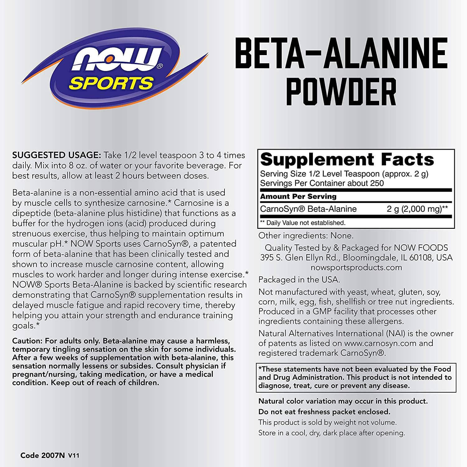 Beta-alanine is a non-essential amino acid that is used by muscle cells to synthesise carnosine. Carnosine is a dipeptide (beta-alanine plus histidine) that functions as a buffer for the hydrogen ions (acid) produced during strenuous exercise, thus helping to maintain optimum muscular pH. NOW Sports uses CarnoSyn®, a proprietary form of beta-alanine that has been clinically tested and shown to increase muscle carnosine content, allowing muscles to work harder and longer during intense exercise. NOW® Sports Beta-Alanine is backed by scientific research demonstrating that CarnoSyn® supplementation results in delayed muscle fatigue and rapid recovery time, thereby helping you attain your strength and endurance training goals.