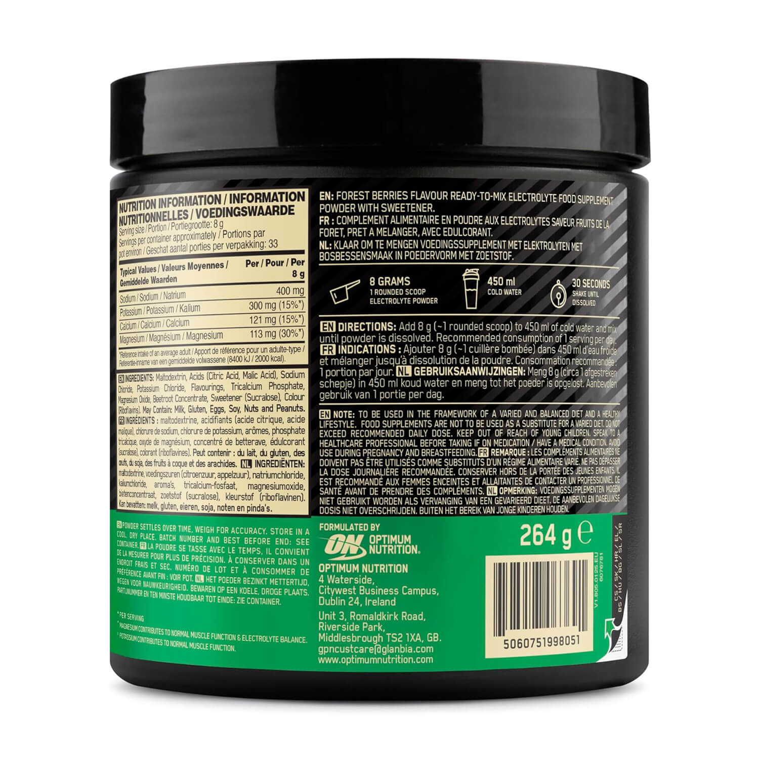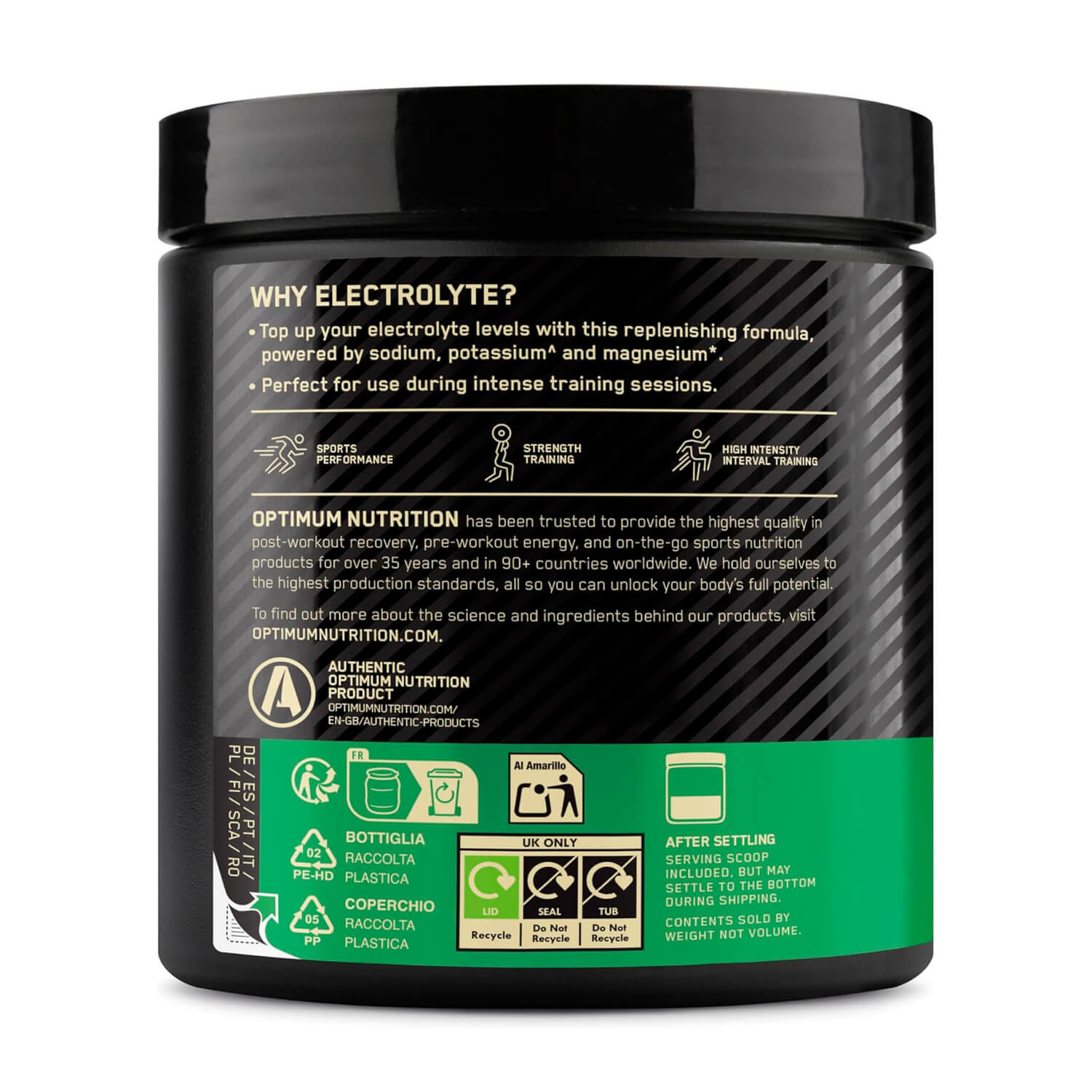 Top up your electrolyte levels with this replenishing formula, powered by sodium, potassium▲ and magnesium*. Perfect for use during intense training sessions. In two refreshing flavours – lemon and forest berries – Optimum Nutrition Electrolyte powders mix easily in water for a convenient boost to your workouts. * Magnesium contributes to normal muscle function & electrolyte balance ▲ Potassium contributes to normal muscle function ^ per serving OPTIMUM NUTRITION has been trusted to provide the highest quality in post-workout recovery, pre-workout energy, and on-the-go sports nutrition products for over 35 years and in 90+ countries worldwide. We hold ourselves to the highest production standards, all so you can unlock your body’s full potential. To find out more about the science and ingredients behind our products, visit OPTIMUMNUTRITION.com. * Magnesium contributes to normal muscle function & electrolyte balance ▲ Potassium contributes to normal muscle function ^ per serving