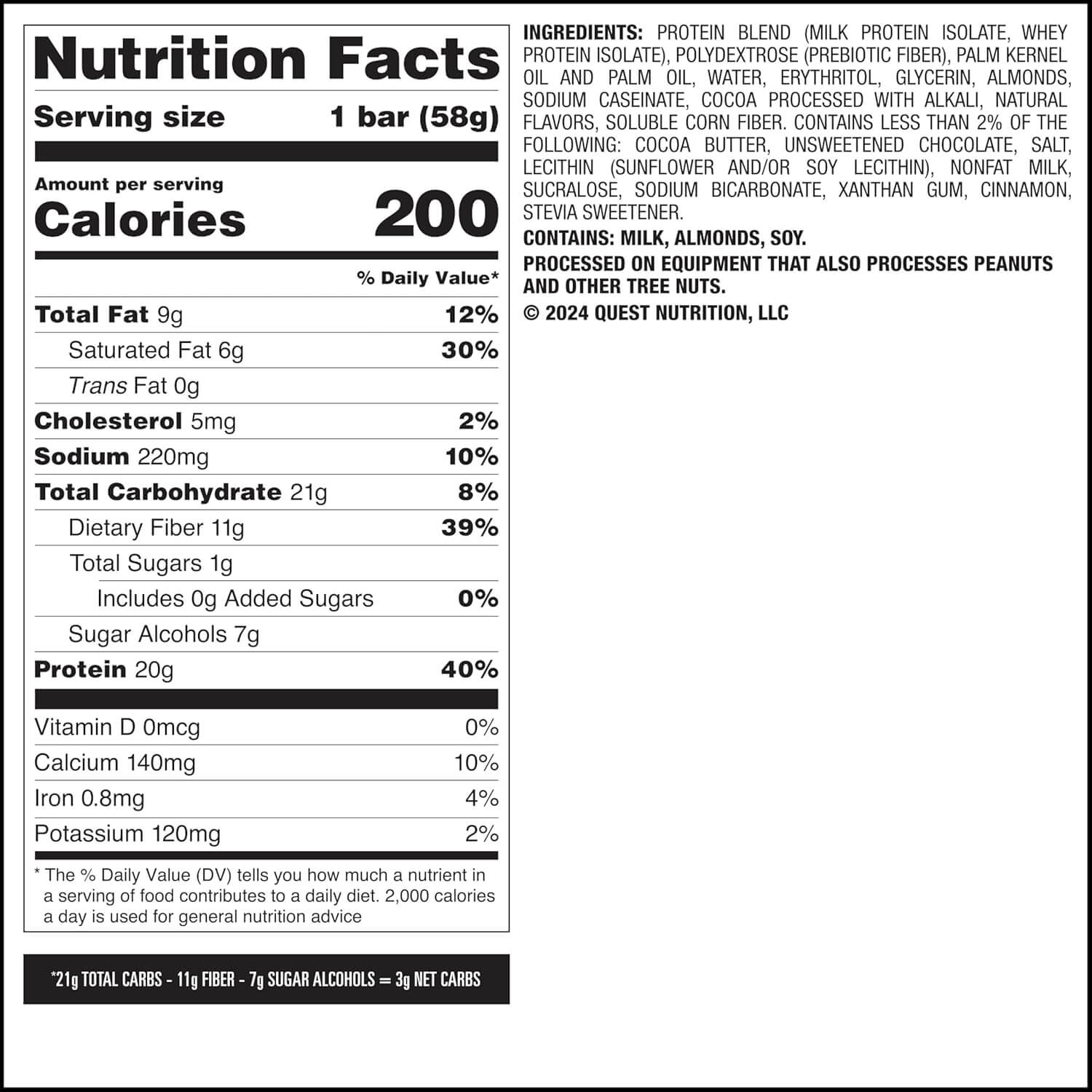 PROTEIN BLEND (MILK PROTEIN ISOLATE, WHEY PROTEIN ISOLATE), POLYDEXTROSE (PREBIOTIC FIBER), PALM KERNEL OIL AND PALM OIL, WATER, ERYTHRITOL, GLYCERIN, ALMONDS, SODIUM CASEINATE, COCOA PROCESSED WITH ALKALI, NATURAL FLAVORS, SOLUBLE CORN FIBER. CONTAINS LESS THAN 2% OF THE FOLLOWING: COCOA BUTTER, UNSWEETENED CHOCOLATE, SALT, LECITHIN (SUNFLOWER AND/OR SOY LECITHIN), NONFAT MILK, SUCRALOSE, SODIUM BICARBONATE, XANTHAN GUM, CINNAMON, STEVIA SWEETENER.