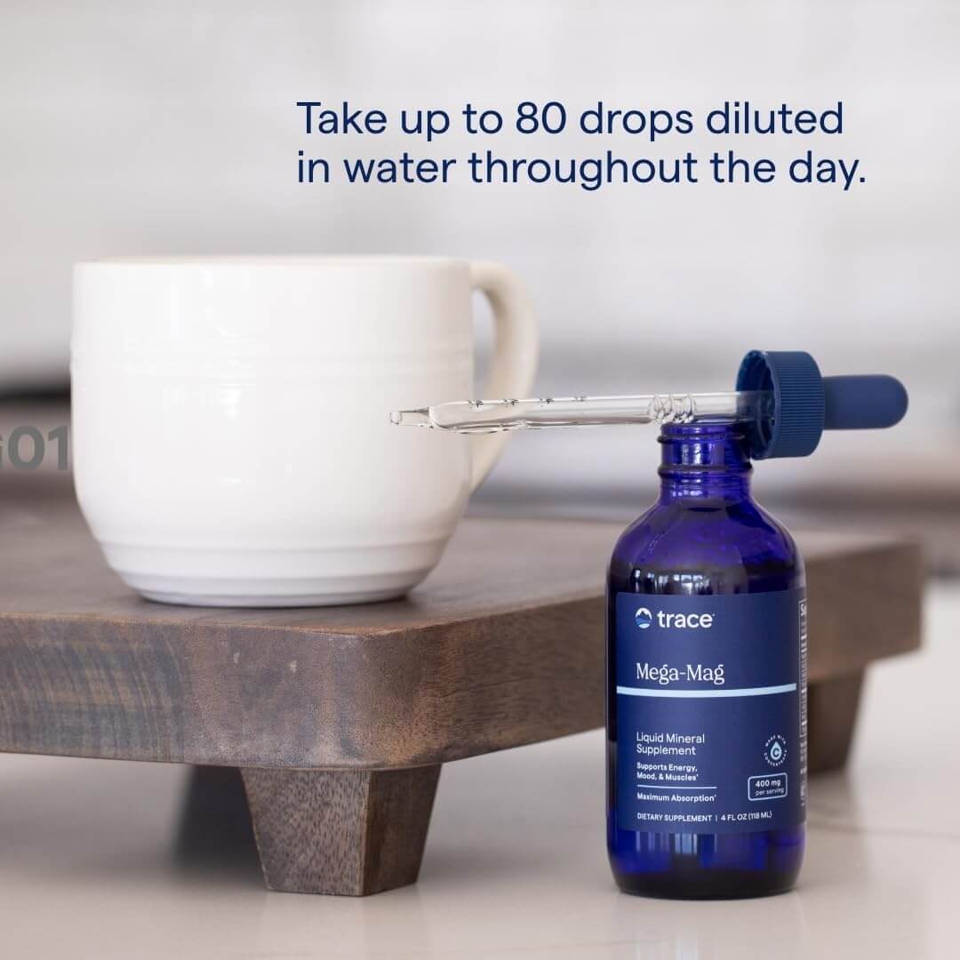 Take up to 4mL (0.8 tsp = 80 drops) daily, spread throughout the day. Follow the daily usage instructions above if it is your first time taking Mega-Mag. Do not refrigerate. A high intake of magnesium may cause a laxative effect. If this occurs, simply reduce the amount per serving.