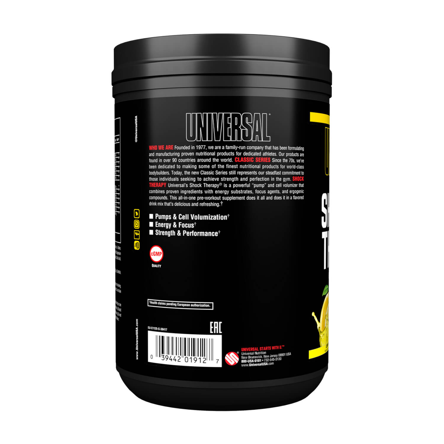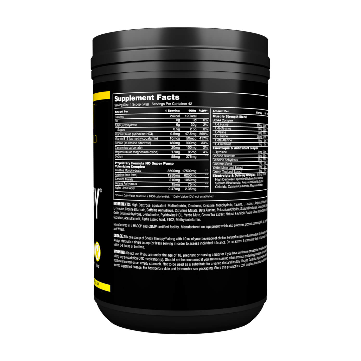 Universal’s Shock Therapy® is a powerful “pump” and cell volumizer that combines proven ingredients with energy substrates, focus agents, and ergogenic compounds. This all-in-one pre-workout supplement does it all and does it in a flavored drink mix that’s delicious and refreshing.