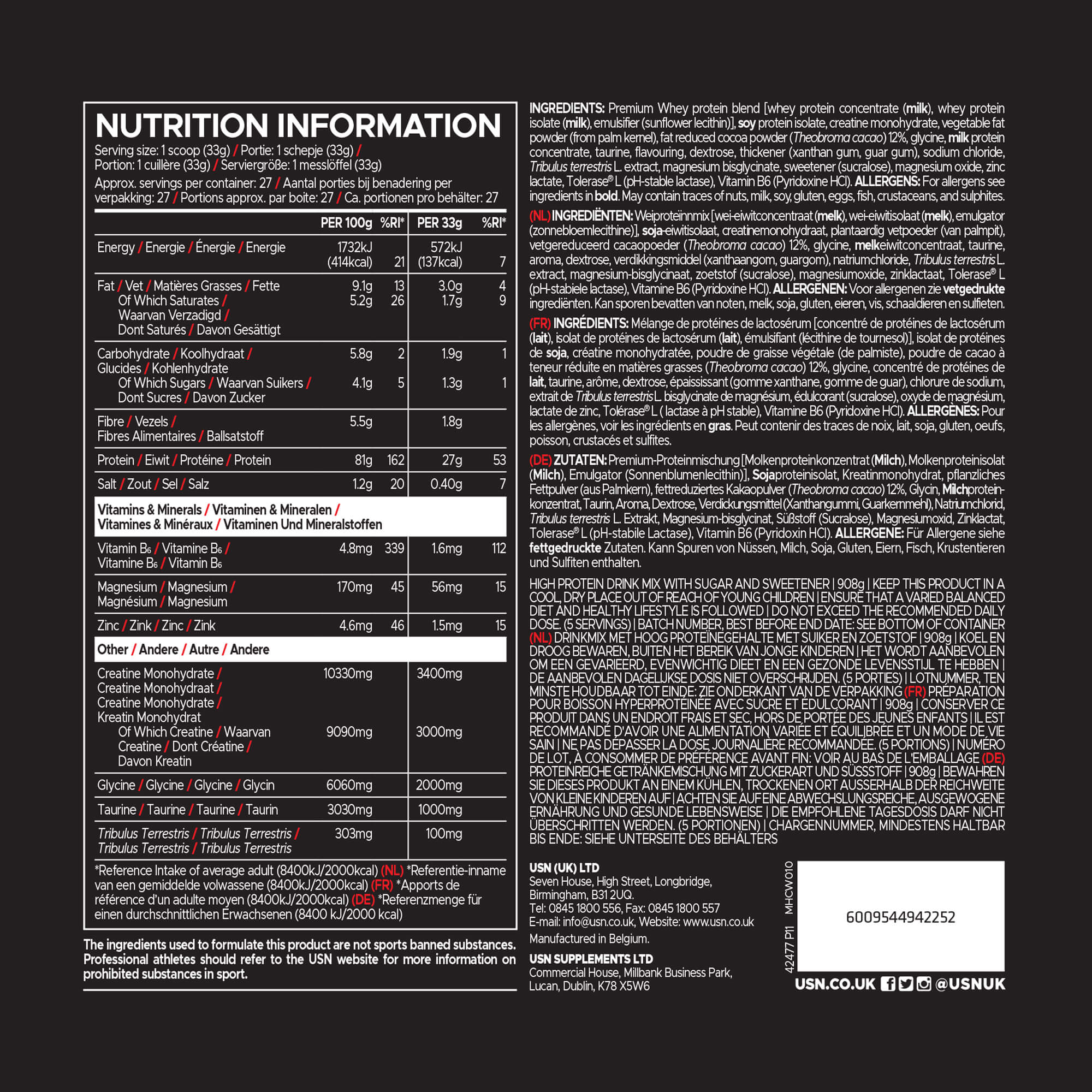 Whey protein blend [whey protein concentrate (milk), whey protein isolate (milk), emulsifier (sunflower lecithin)], soy protein isolate, creatine monohydrate, vegetable fat powder (from palm kernel), glycine, milk protein concentrate, taurine, flavouring, maltodextrin, dextrose, thickener (xanthan gum, guar gum), sodium chloride, Tribulus terrestris L. extract, magnesium bisglycinate, sweetener (sucralose), magnesium oxide, zinc lactate, Tolerase™ L (pH-stable lactase), Pyridoxine HCl.