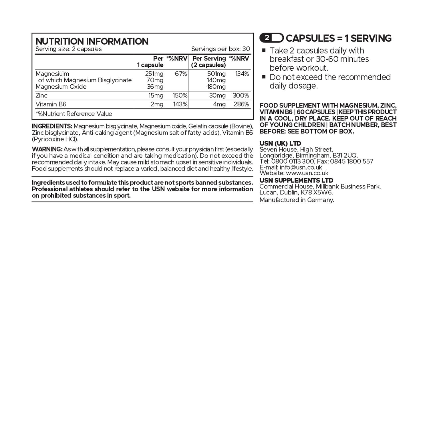 FOOD SUPPLEMENT WITH MAGNESIUM, ZINC, VITAMIN B6 | 60 CAPSULES | KEEP THIS PRODUCT IN A COOL, DRY PLACE. KEEP OUT OF REACH OF YOUNG CHILDREN | BATCH NUMBER, BEST BEFORE: SEE BOTTOM OF BOX.
